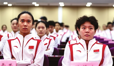 7月13日,巴黎奥运会中国体育代表团成立动员大会在北京举行。中国体育代表团成员朱雪莹(左)在大会上。 新华社发