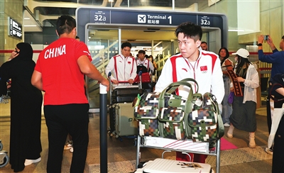 昨天,参加巴黎奥运会的中国乒乓球队成员王楚钦(前右)抵达法国巴黎戴高乐机场。