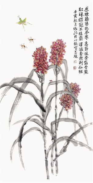 展览共展出王振德先生50余幅书画精品力作和30余部学术著作。作品充溢着美善之怀的时代气息和强烈的社会责任感,彰显了王振德先生深厚的家国情怀和高雅的生活情趣。如《红珠缀冠》图,选材独特,画家把不被人们注意的红高粱作为绘画题材。一只展翅高飞的绿蚱蜢和两只飞翔的马蜂,在缀满枝头、沉甸甸的红高粱的映衬下显得格外引人注目。高粱叶以酣畅饱满、雄健老辣的篆书笔法绘出,疏密有致。仔细观看会发现一只瓢虫行走于叶间。画面动静结合、工写兼用、张弛有度、情趣盎然。王振德先生倡导中国画是以人格为根基,以学识为依托,以物象抒情志,以笔墨气韵为表现,以奉献人民为归宿的中华国粹,而非单纯炫技糊口的江湖之术。中国画素重文化品位,将诗文书画印与文史哲法等连通一体,皆源于中华文脉。他的绘画作品多具有强烈的记事特征。高粱、蚱蜢、马蜂、瓢虫等这些生活中司空见惯、平淡无奇的物象会唤起我们儿时的记忆和浓浓的乡愁,润物无声,感人至深。画家运用象征手法,以高粱为喻赞扬劳动人民朴实勤劳、勇敢善良、不骄不躁的高尚品德,同时也表达了自己“痴翁犹有千里志,诗文书画报家国”、服务人民大众的初衷。王振德先生将画品、人品、文品合而为一,表现出属于自己的人文情怀、艺术操守和价值观。