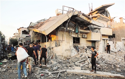 7月15日,在加沙地带迈加齐难民营,人们查看遭到以军袭击的建筑废墟。 新华社发