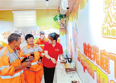 环卫工人在驿站内休息纳凉,品尝酸梅汤和刨冰。 本报记者 吴迪 摄