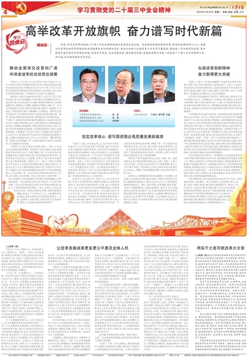 把学习贯彻全会精神与学习贯彻习近平总书记关于全面深化改革的一系列新思想、新观点、新论断和视察天津重要讲话精神贯通起来、结合起来,按照习近平总书记“在进一步全面深化改革开放上善作善成”的重要要求,立足改革开放先行区的功能定位,围绕深入推进京津冀协同发展、发展新质生产力、高水平对外开放、文化传承发展、城市治理现代化等方面聚力、发力,行动迅速、脚步稳健,确保各项目标任务和重点举措见行见效。