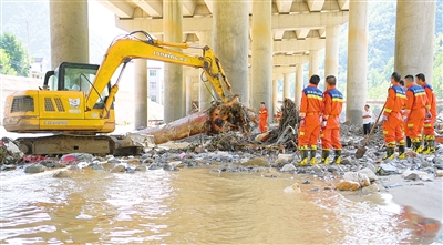 图为7月21日,救援人员在陕西柞水高速公路桥梁垮塌下游河道进行搜救。