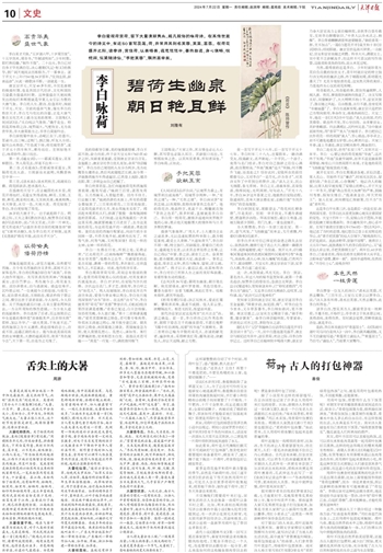 李白爱观荷赏荷,留下大量清丽隽永、超凡脱俗的咏荷诗。在其传世至今的诗文中,有近50首写及莲、荷,并常用其别名芙蓉、芙蕖、菡萏。在荷花盛开之际,读李诗,赏佳荷,以美悟美,遐思悠悠中,暑热自退,身心俱畅,恍惚间,似紧随诗仙,“手把芙蓉”,飘然高举矣。