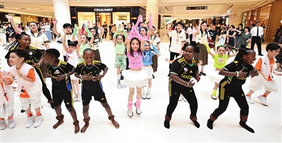 来自坦桑尼亚、中国澳门及华夏未来的中外少儿团队在河西区万象城进行舞蹈、声乐、合唱等“快闪”表演。 本报记者 胡凌云 刘欣 摄