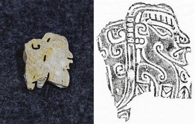 左图是2024年7月10日在四川省文物考古研究院拍摄的玉石上阳刻的侧身人像;右图是玉石上阳刻的侧身人像拓片。