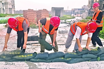 为应对暴雨天气,中国一冶施工人员在东丽区金钟二期保障性住房项目安放专用沙袋,做好防汛工作。 本报记者 张磊 摄