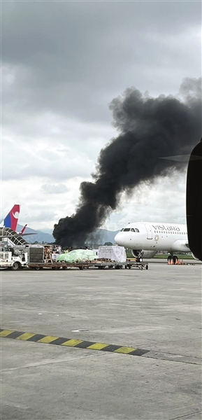 7月24日,在尼泊尔加德满都,一架客机在特里布万国际机场坠毁后冒出黑烟。 新华社发