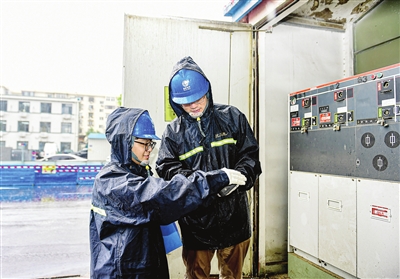 昨日,国网天津城西公司配电运检室运行员对配电设备进行特巡和带电检测,检查站房漏雨情况,保障大雨天气下配电线路安全稳定运行。