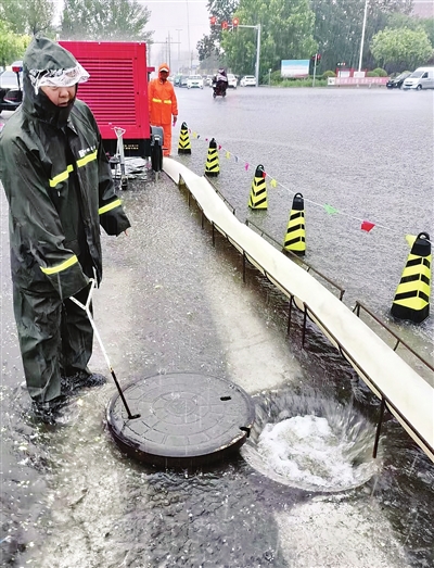 驻津央企中建六局水利水电公司组织200余人的防汛队伍,在我市各积水点位配合排水部门进行排水作业。 本报记者 张磊 摄