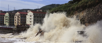 随着今年第3号台风“格美”逼近,叠加潮汐等因素,25日,浙江省温岭市石塘镇金沙滩海域掀起十多米高的巨浪。 新华社发