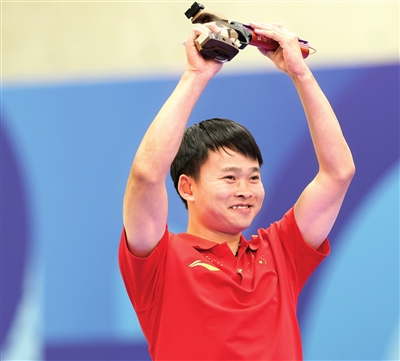 在射击男子10米气手枪决赛中,中国选手谢瑜夺冠。