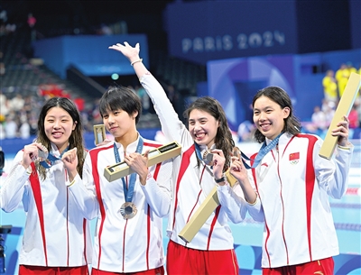 本报讯(记者 李蓓)北京时间昨天凌晨,在巴黎奥运会女子4×100米自由泳接力决赛中,由杨浚瑄、程玉洁、张雨霏、吴卿风组成的中国队以3分30秒30夺得铜牌,破亚洲纪录。而男子4×100米自由泳接力赛,中国队第1次晋级该项目决赛。潘展乐、季新杰、陈俊儿、王浩宇接力游出3分11秒28的成绩,最终获得第4名。其中,潘展乐第1棒以46秒92的成绩打破奥运会纪录。