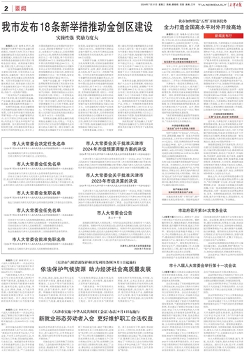 会议表决通过了促进天开高教科创园发展条例、气候资源保护和开发利用条例,表决通过了新修订的实施工会法办法;审议了市人大常委会和区人大常委会规范性文件备案审查条例草案、法律援助若干规定修订草案、促进会展业发展条例草案、大运河文化遗产保护传承利用条例草案、安全生产条例修订草案、公共消防设施管理条例草案。分组审议时,常委会组成人员对有关地方性法规草案提出了意见建议。