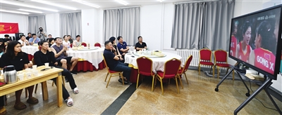 昨天凌晨,天津女排集体观看了中国女排的比赛。 本报记者 孙震 摄