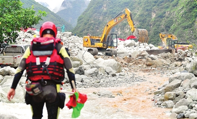 8月4日,在四川甘孜州康定市姑咱镇日地村,救援人员搜救失联人员。
