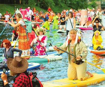 俄罗斯圣彼得堡3日举办一年一度的丰坦卡国际桨板节,吸引了很多民众参加。 新华社发