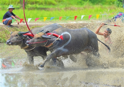 8月4日,参赛者在泰国春武里府驾驭水牛参加比赛。春武里府当日举行赛牛活动,以庆祝当地水稻播种季节开始。