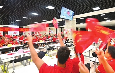 天津游泳队所有在津训练的运动员、教练员一起观看了奥运会男子4×100米混合泳接力比赛。天津运动员王长浩与队友团结协作、奋勇争先,为中国代表团再添一金,实现天津男子游泳的奥运金牌突破。 本报记者 孙震 摄