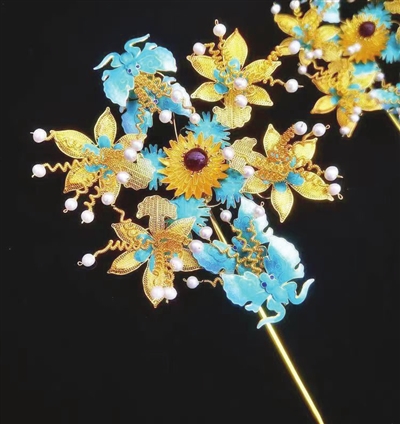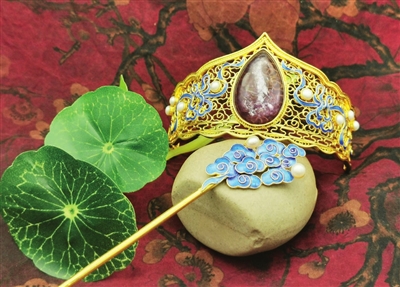 我们合作得挺好的,创业没多久,我设计的一个头冠当时很受市场欢迎,可这个产品上市销售没有多长时间,网上就出现了仿品,而且那个仿品卖得还非常好。我当时的心情还是比较奇怪的,一点也不气愤,反而有点小欣喜,因为我并非专业珠宝设计出身,这是我刚刚进入市场摸爬滚打,随手设计的这么一款头冠,竟然这么受欢迎,想起来我也沾沾自喜。为什么那个仿品比我们卖得还好呢?因为价格便宜,印象中好像是几百元吧,材质应该是合金,工艺是机器铸造,而我们产品的价格要4000多元,材质是银镀金,工艺是纯手工的花丝镶嵌技艺。市场上有很多仿花丝镶嵌的产品,价格非常低,销售量很大,毕竟每个人的消费观不同,但还是有一部分人喜欢传统手工花丝镶嵌的产品,即使价格贵,喜欢的人还是会来买。我创办工作室的意义之一,就是通过设计制作一些多元化的产品,在保证品质的基础上,能够让更多的人接触到花丝镶嵌产品,也会让更多的人了解这项传承久远的中国传统手工技艺。在这个推广传承传统文化的过程中,我收获了很多客户的认可,也获得了一定的经济效益。获得经济效益也是我继续进行再创作的基础。例如我想创作一些大体量的重工的工艺摆件。