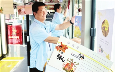 本报讯(记者 苏晓梅 摄影 张磊)今天,津城迎来立秋节气。昨天,30路驾驶员李双喜在车厢张贴立秋宣传海报和养生小知识贴士,并将亲手制作的立秋明信片送给乘客,让乘客在乘车过程中了解更多节气文化。
