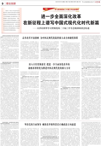党的二十届三中全会开启了新征程上推进中国式现代化的时代新篇,学习好贯彻好党的二十届三中全会精神,是当前和今后一个时期的一项重大政治任务。日前,天津社科界学习贯彻党的二十届三中全会精神座谈会在天津市社会科学界联合会召开。与会专家学者结合天津实际,深入交流加强学习宣传、研究阐释党的二十届三中全会精神的思路和建议。