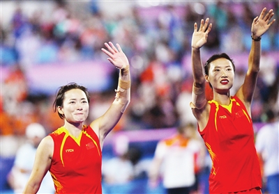 中国队获女子曲棍球项目银牌,图为球员们在决赛后向观众致意。(右为天津选手李红)