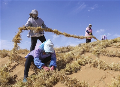 治沙工人在宁夏中卫市境内的腾格里沙漠铺设刷状网绳式草方格沙障。