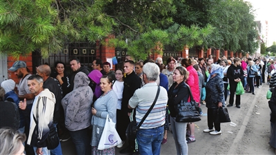 8月13日,在俄罗斯库尔斯克市,来自俄乌边境地区的居民排队领取救援物资。
