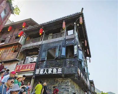 走进西街,映入眼帘的就是飞檐翘角的白墙黑瓦,以及沿街一溜铺开的悬空木楼——土家族吊脚楼嫁接徽派建筑。这在多雨、潮湿的武陵山区对防潮和通风极为有利,被现代建筑学家认为是生态建筑形式。西街的吊脚楼多为平地起吊式,吊脚楼整个架构均以榫卯相连,无钉无栓,看起来好像是放上去的,实则都是用一块块木板拼接而成。土家族吊脚楼一般依山就势、错落有致,呈虎坐形,以“左青龙,右白虎,前朱雀,后玄武”为最佳屋场,人神共处,怀抱宇宙自然,西街上的吊脚楼亦多是严格按照这种布局建造。