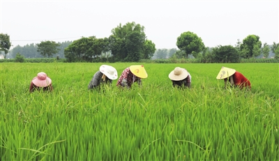 8月21日,在江苏省淮安市洪泽区三河镇,农民在水稻田间除草。处暑将至,各地农民抢抓农时开展农事劳作,田间地头一派繁忙景象。 新华社发