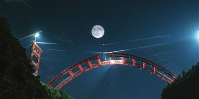 8月21日,由贵州桥梁集团承建的贵阳至平塘高速公路马场河特大桥主拱顺利合龙。马场河特大桥位于贵州省贵定县盘江镇马场河村,大桥全长381.5米、主跨260米,是G7522贵阳至北海高速公路贵阳至平塘段控制性工程。图为月光下的贵阳至平塘高速公路马场河特大桥(二次曝光照片)。