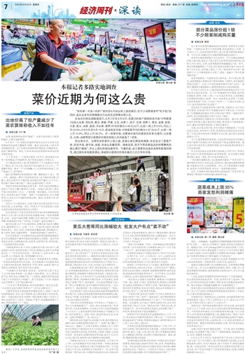 他告诉记者,由于下雨,地里积水,机械设备无法进入棚里作业,摘菜得用人工。以前一个人一天200多元成本,现在涨到400多元。而且,雨后,作物表面会覆盖病菌,用药量加大,算上肥料、农药、运输等费用,一亩地的成本增加了1000多元。