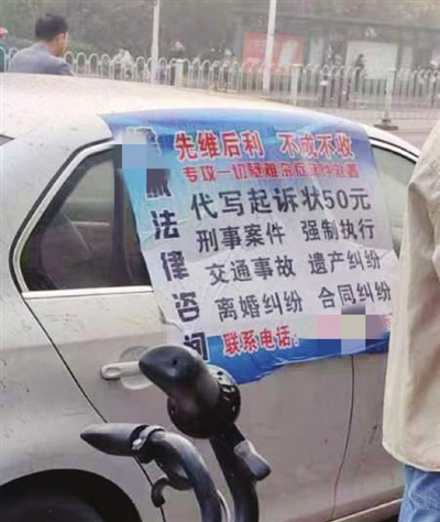 红桥区人民法院门口停放的汽车上,悬挂着“司法黄牛”招揽生意的展牌。