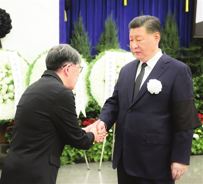 上午9时30分许,习近平、赵乐际、王沪宁、蔡奇、丁薛祥、李希、韩正等,在哀乐声中缓步来到周光召同志的遗体前肃立默哀,向周光召同志的遗体三鞠躬,并与周光召同志亲属一一握手,表示慰问。