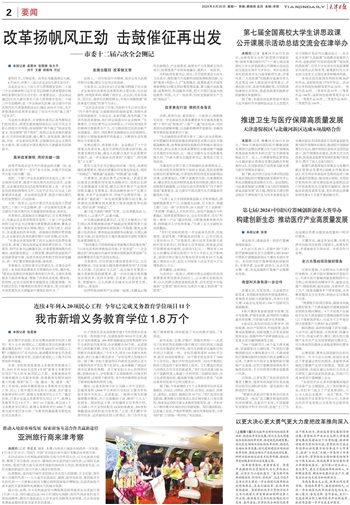 发展出题目,改革做文章。我们要围绕天津现代化建设的实践、高质量发展的实践、满足人民美好生活需要的实践,找准改革切入点、发力点,深化区域一体化、京津同城化体制机制改革创新,推进京津冀协同发展;深化港产城联动发展体制机制改革创新,推进高水平开放发展;深化推动经济高质量发展体制机制改革创新,推进实体经济转型发展;深化城市内涵式发展体制机制改革创新,推进城乡融合发展;深化产学研深度融合体制机制改革创新,推进教育科技人才一体化发展;深化“四个以文”体制机制改革创新,推进文化传承创新发展;