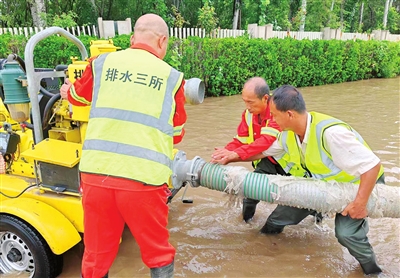 排水职工在河西区梅江道点位进行排水。