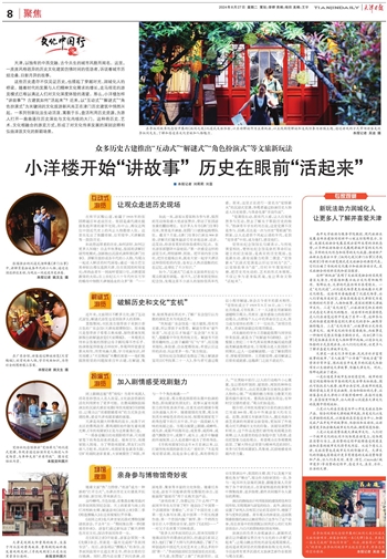 这种“新玩法”表明了文旅深度融合的实践有着巨大潜力,对张扬和展示地方文化有积极作用。陈晔认为,天津的代表性项目很有特点。一是“文化沉浸”,以沉浸式场景更生动地展示天津文化特色。这些项目普遍搭建了沉浸式场景,让人们穿越历史时空,身临其境感受天津特定历史时期的时代背景、人物和故事,更深刻理解天津城市文化。二是“文化演艺”,以旅游演艺和互动的方式感受天津文化的魅力。这些项目的显著特色是人们在游览过程中变成了其中一员,这种参与式的体验更能够感受到天津文化的亲和、幽默等独特魅力。三是“文化传承”,以故事的方式传承天津文化。城市文化的传承需要载体,而故事是一种相对完整且传播力强的方式。比如《津门往事》是依据真实历史人物和事件改编,以适合大众体验的方式呈现出来,让人们记忆深刻,让更多人了解并喜爱天津城市文化。
