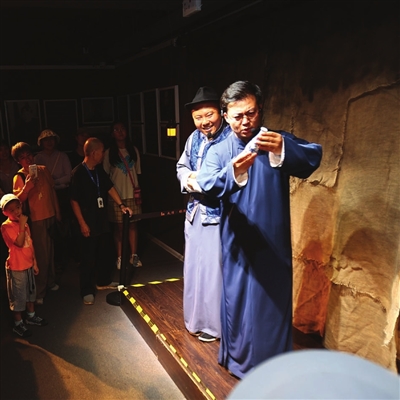 张园推出的沉浸式演绎展《津门往事》中,讲解员装扮成各年代的小人物,通过边演边讲边互动,与观众一同走进历史画卷。