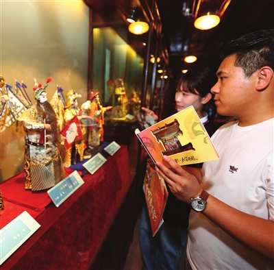 在广东会馆,游客通过解谜游览《天官赐福》,欣赏戏曲人偶,学习戏曲知识,为待补全的图册填上答案。