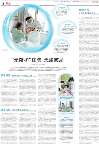 孙丽所说的“无陪护”住院并非没有人陪护,而是指由医院护士或者经过专业培训的医疗护理员为住院患者提供24小时生活照护服务,实现无家属陪护或陪而不护。最早由我市三中心施行,近年来,在浙江、山东、福建、山西、广东等地陆续试点推广,尝试解决患者住院陪护难、陪护贵等社会性难题。