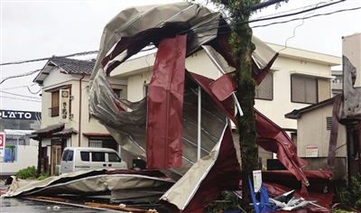 这是8月29日在日本宫崎县宫崎市拍摄的在强风中受损的建筑。 新华社/共同社发