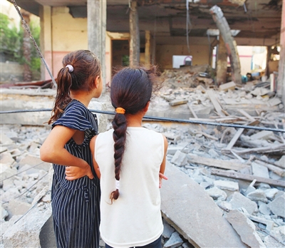 图为8月31日,在加沙地带中部努赛赖特难民营,两名女孩查看以军轰炸后的建筑废墟。