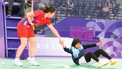 羽毛球女子单打SL3级冠军肖祖贤(左)在比赛中搀扶摔倒的对手。 新华社发
