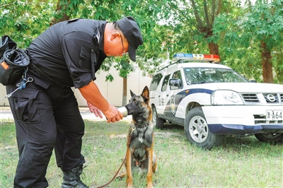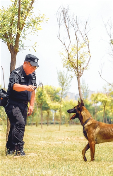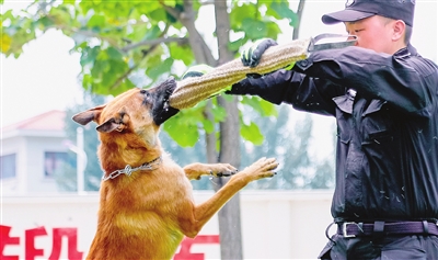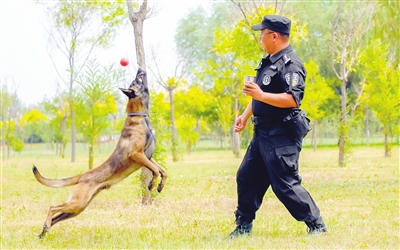“警犬训练没有捷径,只有认真反复训练,才能让警犬形成条件反射,从而达到工作要求的标准。坐、卧、立这些看似简单的动作,都需要成百上千次的反复训练。而追踪、扑咬等科目更是需要训导员陪着警犬头顶烈日一起跑。一场训练下来,挥汗如雨。”警犬很怕中暑,最近接连高温天气,训导员们为了能在天气相对凉快的时段训练警犬,每天6点上班,20点才下班,宁可自己加班,也不让警犬在酷暑中训练。