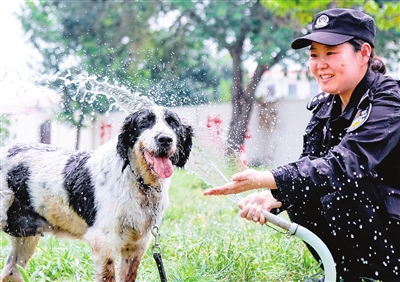 去年,“黑豹”离开石奔时,这位特警硬汉子哭得不能自已,在训练场上迎着风雨哭着跑了5000多米,他试图以这种方式去发泄悲伤的情绪;同样在去年,“利奥”离开柴林前,只能拖着右后腿艰难行走,脚趾经常被磨破,在地上留下一片血迹,但只要跟着柴林出去,不管去干什么,它都像从前一样开心,而柴林心里却有说不出的难受……如今,何蕊的“小七”也即将走向生命的尽头。记者见到“小七”时,它几乎是拖着后腿在向前挪动,速度非常慢,可当何蕊把它带到草地上洗澡时,它眼睛里有光,水喷洒在它身上,何蕊的手还像从前那样温柔地抚摸着它的毛发时,它表现得那么开心快乐。可当返回犬舍时,它的后腿几乎支撑不住,差点摔倒在地。何蕊告诉记者,“小七”已经15岁了,它现在是养老状态,可能随时会离开,尽管已经做好了心理准备,但她还是害怕那天的到来,“我一定会哭。”说着,何蕊的眼圈红了。
