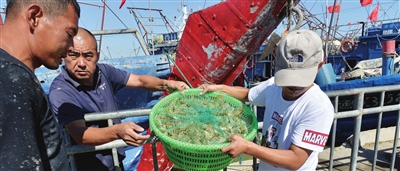 渔船靠泊码头后将捕捞到的海鲜运送上岸。 本报记者 周伟 摄