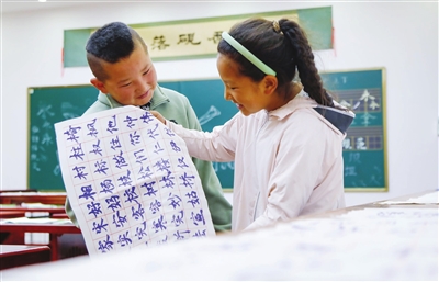 昌都市卡若区小学学生在汉语书法教室学习汉语。