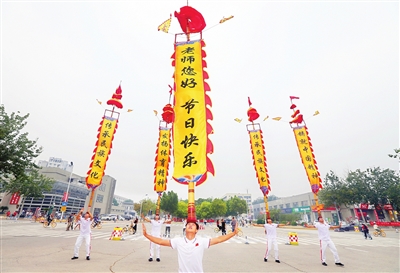 第40个教师节来临之际,天津师范大学学生民间艺术团中幡队的同学们在校园进行非遗技艺“宫前中幡”表演,用传统文化向老师和未来的老师们致敬。