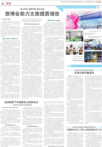 “2024旅博会将加速文化与旅游两大领域的深度融合,促使文旅项目更加注重文化内涵的挖掘与呈现,通过整合地方历史遗迹、民俗风情等文化资源,开发出具有深度文化体验的产品,促进文旅市场的多元化发展,或将开启天津文旅深度融合的新篇章。”天津社会科学院经济分析与预测研究所副所长、研究员董微微表示。